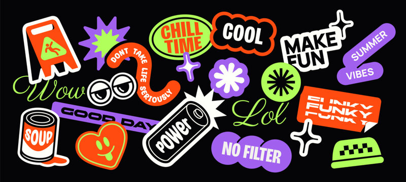 Cool Trendy Y2k Stickers Collage Pattern. Smile Emoticon Patches Vector Design. Pop Art Illustration.