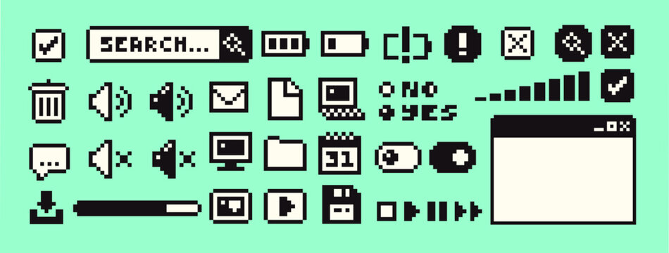 A collection of retro pixelated user interface icons. Creative digital assets for web and app design with a nostalgic 90s aesthetic for your DIY digital projects
