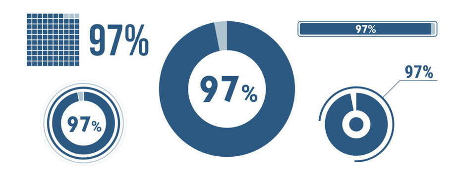 97% percentage infographic set. Ninety-seven circle diagram, pie donut chart, progress bar. 97 percent loading data icon. Vector concept collection.