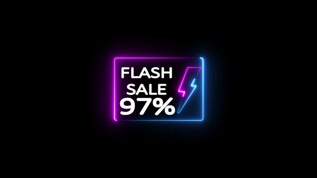 Neon flash sale promotion with 97% percent discount, glowing lightning bolt and rectangle frame on black background for limited time offer