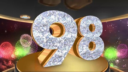 98th birthday animation in gold and diamonds with fireworks background,