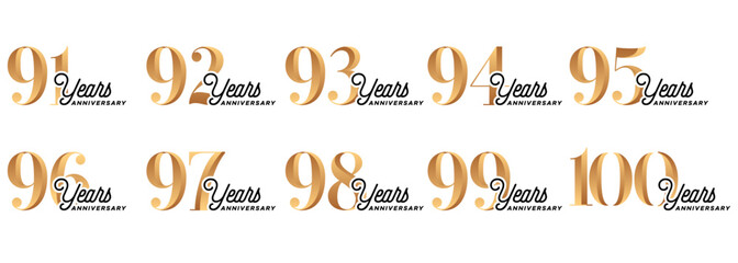 set of anniversary logos from 91 year to 100 years with gold numbers on a white background for celebratory moments,celebration event.