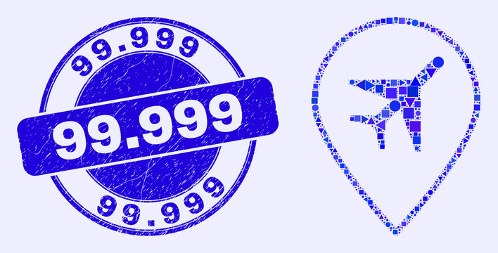 Geometric airport map marker mosaic icon and 99.999 seal stamp. Blue vector rounded textured seal stamp with 99.999 caption. Abstract mosaic of airport map marker created of round, tringle,