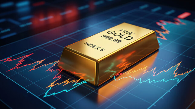 Shiny gold bullion bar marked FINE GOLD 999 99 INDEX 3 resting on glowing financial charts conveying market optimism