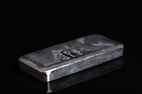 Silver bar on a glass plate, against black background. Stamped cast silver ingot, of one kilogram, about 32 troy oz of metal, with a purity of 999.0, that is 99.9 percent pure silver. Side view. Photo