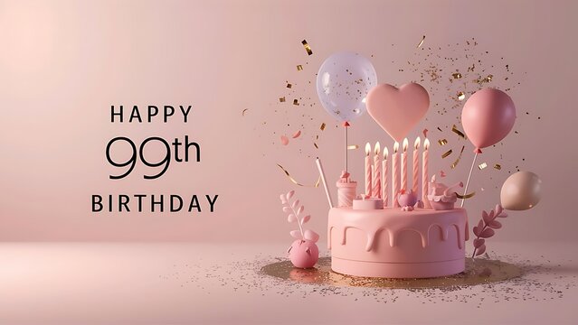 Minimalist 3D Pastel theme Happy 99th Birthday Background With Illustration Of Cake, Balloons, Heart And Confetti, 3d Happy Birthday Background