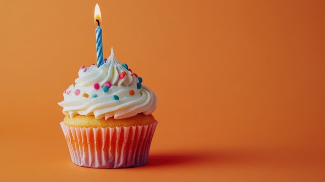 Celebrating 99th birthday with cupcake and candle on orange backdrop