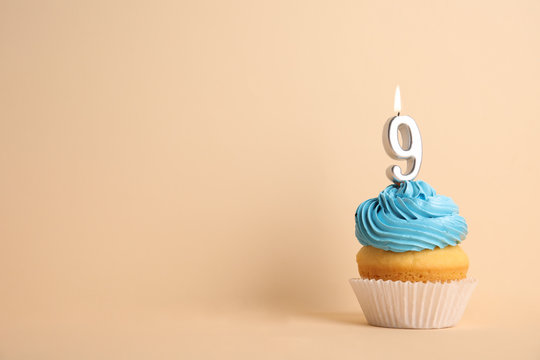 3D Rendering of pastel birthday cake party with candle number 9 with copy space on blue background. 3D Render illustration.