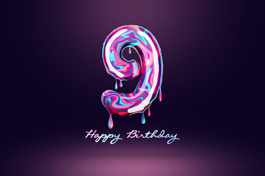 nine year anniversary background, number from pink candy on dark background. Concept for happy birthday background, brochure template, party, poster. 3D illustration, 3D rendering.