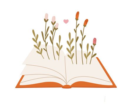 Vector illustration of an open book with flowers growing, and heart. Illustration dedicated to the Day of Book Lovers, August 9. The concept of reading growth, promotion of reading. Hand-drawn.