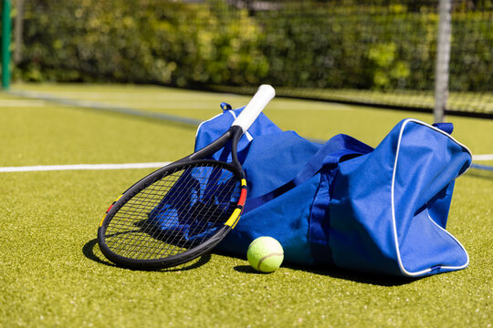 Tennis racket, ball and sports bag on sunny outdoor grass tennis court
