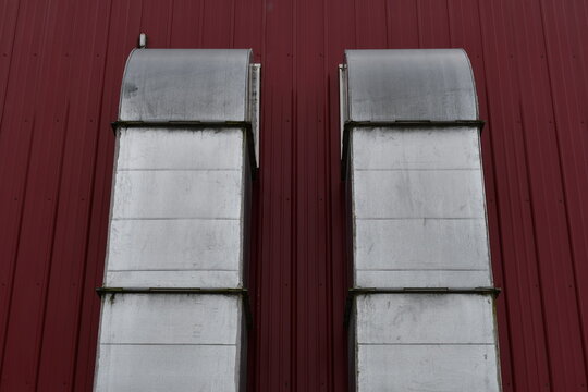 A/C ducts going into large red steel building.