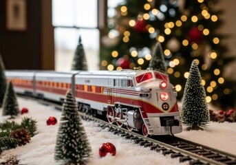 Festive model train set with Christmas tree and holiday decorations