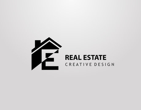 E Letter Logo. house shape with negative letter H, Real Estate Architecture Construction Icon Design.