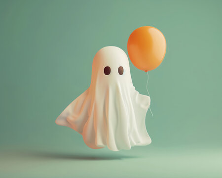 3D illustration of a friendly ghost with an orange balloon, headshot on a solid green background, viewed from the front