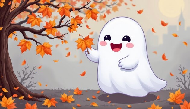 A cheerful cartoon ghost on a vibrant orange background celebrating Halloween festivities