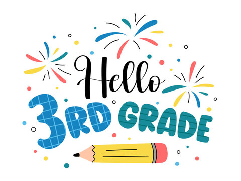Hello 2nd Grade Back to School colorful fun vector illustration with text, pencil, and fireworks. Second grade classroom decor, poster, sublimation. Welcome back to school