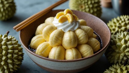 Delicious Durian Dessert Bowl with Whipped Cream Surrounded by Fresh Durian Fruits on a Stylish Blue Background