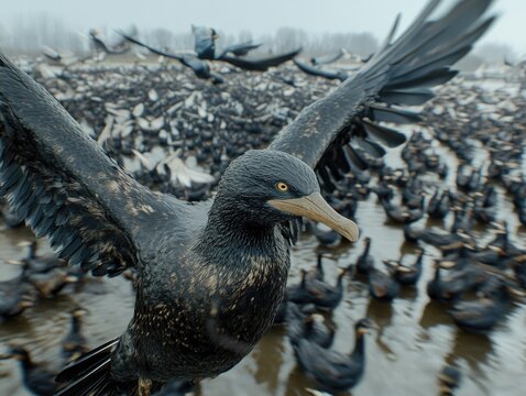A dark-colored seabird soars above a large flock of waterfowl.