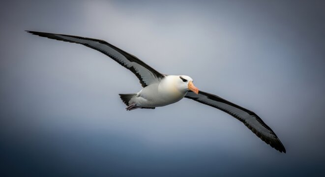 A black browed albatross in mid flight. Large seabird with an impressive wingspan soaring through the air. Wildlife conservation and nature's power. Freedom and journey concept