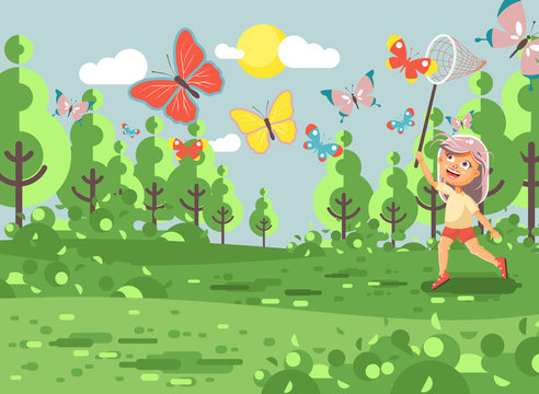 Vector illustration cartoon character lonely child, young naturalist, biologist blonde girl catch colorful butterflies with net, scoop-net, hoop-net on nature outdoor background in flat style