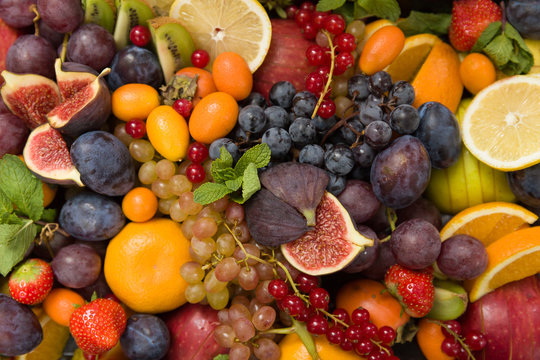 Top view on mixture of different fruit and berries: lemons, figs, grapes, tangerines, apples, strawberry, plums, red current, oranges. Healthy food concept