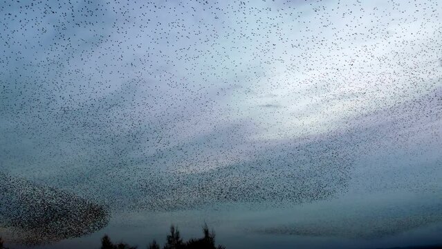 Large flock of starlings gathering on a winter  evening making amazing shapes