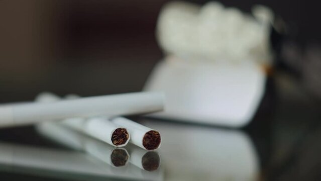An open pack of cigarettes with cigarettes on the table. The focus shifts from the pack to the cigarettes. nicotine addiction. relieving stress and worries. a bad habit that leads to illness and death