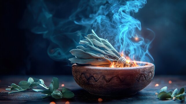 Smudging sage bundle in bowl, dark background, spiritual ritual