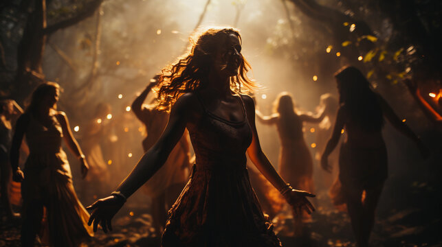 Silhouette of mystic woman in black background of fire fly flame, spark, of contour outline. Adult sexy of young girl witchcraft ceremony ritual dance in underclothes. Outdoor slow motion. Caucasian.