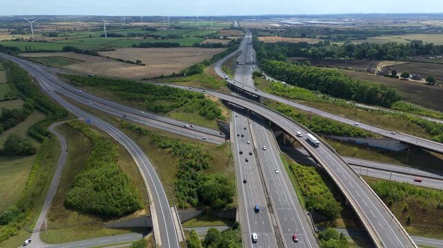 Aerial drone view of busy motorway junctions intersection, lots of traffic and diverging roads, M1 A1 near Rugby England UK