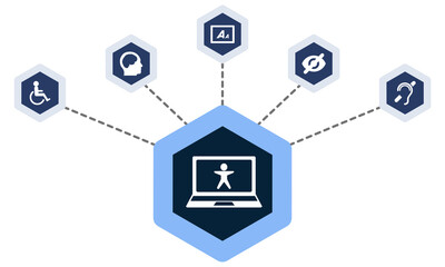 Web Accessibility illustration with icons in hexagons and a laptop computer