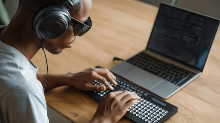 Blind man using braille display with laptop.
