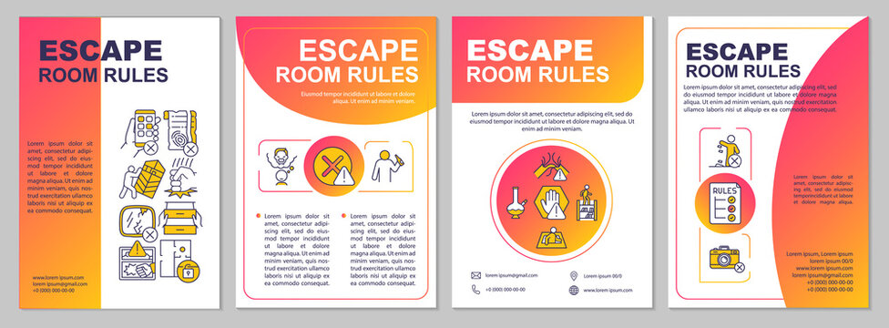 Escape room safety regulations red gradient brochure template. Leaflet design with linear icons. 4 vector layouts for presentation, annual reports. Arial, Myriad Pro-Regular fonts used