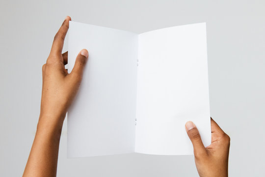 Studio shot of an ethnic or black model holding an A5 or folded letter size blank mockup