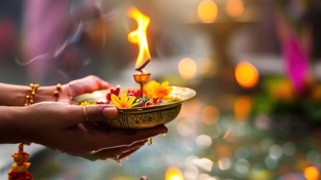 Beautiful aarti thali decorated with colorful flowers. Hindu festivals ritual tradition. High quality