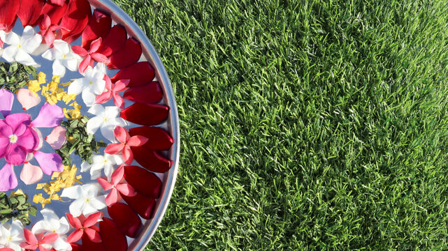 Beautiful Aarti thali flower rangoli decoration on steel plate for aarti and pooja