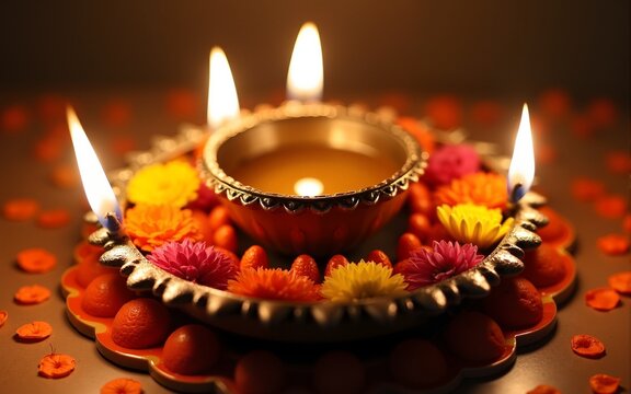 Traditional indian puja thali with lit diyas, marigold flowers, and kumkum powder, symbolizing auspiciousness and devotion during religious rituals