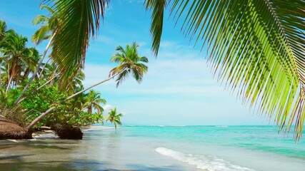 Bahamas clear blue sea and white sand. Beach and sea and sky tropical paradise beach background. Bahamas palms beach landscape.