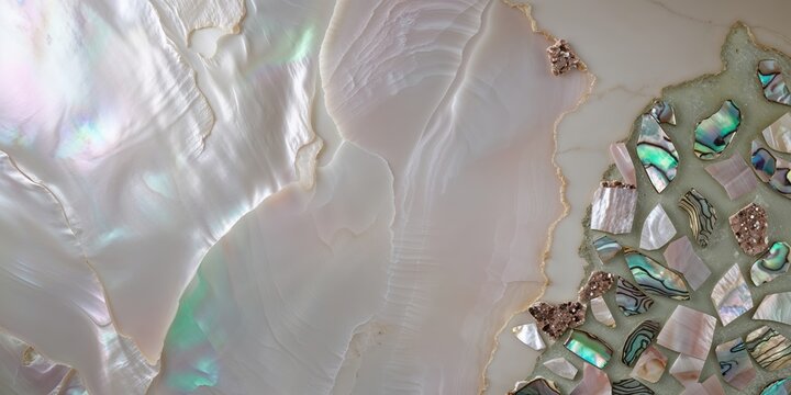 Luxurious Mother of Pearl and Abalone Mosaic Surface Close Up Elegant Shimmering Texture