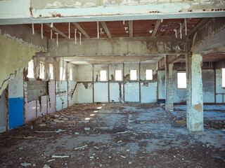 Interior view of a dilapidated church with sunlight streaming through arched windows and damaged roof.