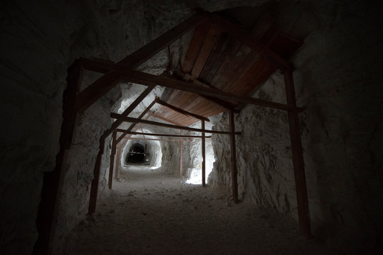 Flashlight or Torch on Walls of Abandoned Mine Tunnel