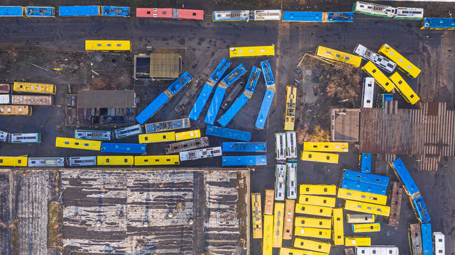 Abstract composition. Yellow and blue buses and cars aerial top view.  abandoned transport parking. shabby and broken vehicle of the times of the USSR. Aerial top view drone photo. Kyiv Kiev Ukraine