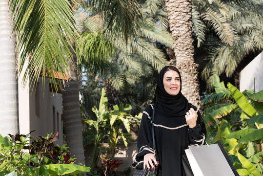 Arabic women wearing traditional middle eastern abaya clothing in Dubai, shopping and having fun outdoors