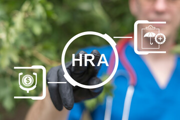 HRA - Health Reimbursement Arrangement Medical Concept. Doctor using virtual touch screen presses the abbreviation HRA.