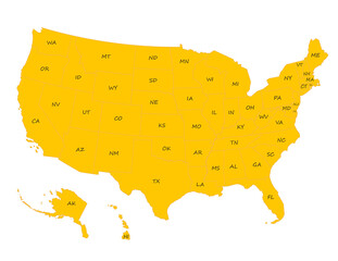 Vivid Yellow United States Of America Map With Labels On White Background