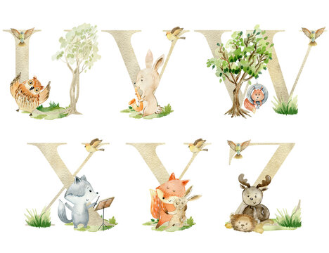 Adorable forest animals adorning alphabet letters for enchanting childrens educational displays and nature themed party decorations