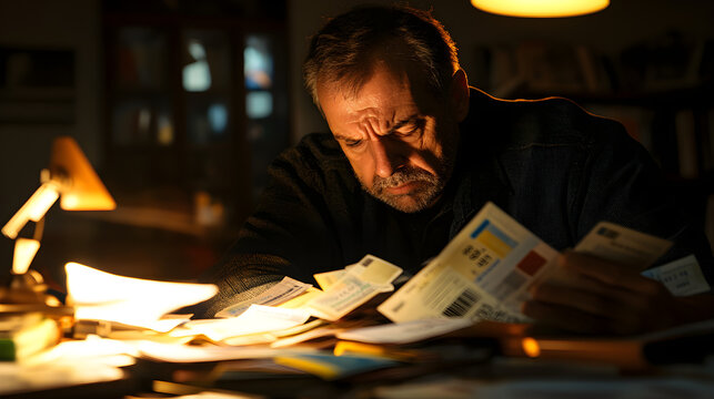 Besorgte Person umgeben von Rechnungen und Kreditkarten