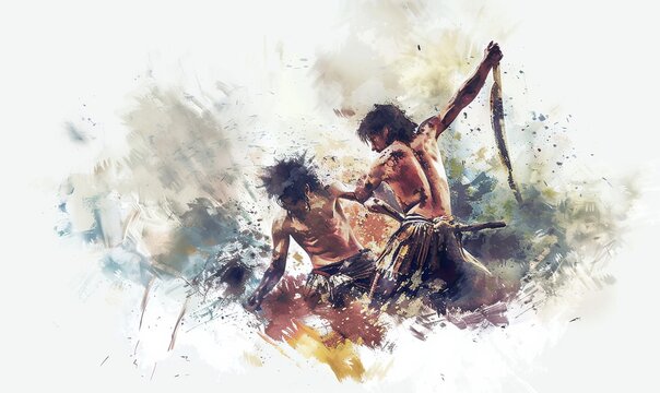 In a vivid watercolor illustration, Cain confronts Abel in a moment of intense emotion, highlighting jealousy and the consequences of their actions rooted in a biblical tale