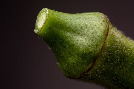 Close up macro shot of hairy top of Okra or Ladies' fingers vegetable against a dark grey background. Studio well lit low key still life.
